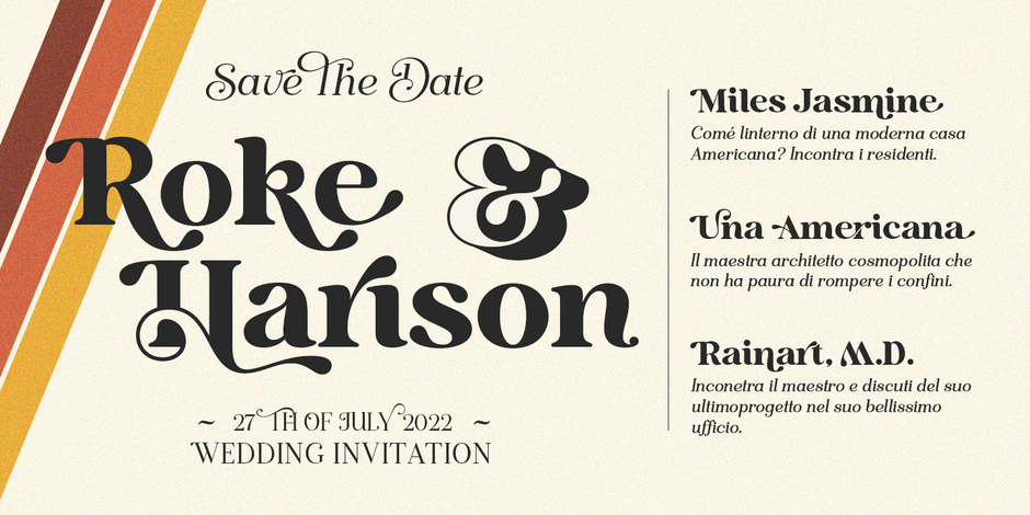 Script types such as Snell Roundhand® and Gigi™ have such strong personalities they almost invariably conflict and compete for attention when coupled with each other. Otherwise, scripts exist in harmony with nearly all sans serifs, as well as serif typefaces, from the staid Century Schoolbook® to the sophisticated New Velovic® and Avenir® Next families