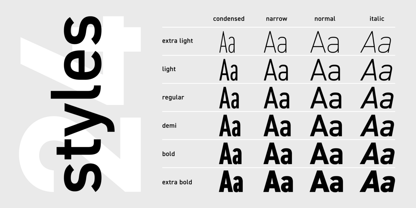 DIN shines through as a defining typeface of the modern grotesque genre and is in fact one of the most popular fonts in use today. DIN 2014, specifically, stands out with several unique features such as a range of narrow styles, straight vertical segments in both uppercase and lowercase ovals, and the option to toggle between oblique and italic styles via a stylistic set. The core DIN 2014 typeface family, meanwhile, boasts three different width variations (Regular, Narrow, Condensed) and 24 styles. DIN 2014 supports over 150 languages including Extended Latin and Cyrillic scripts.
