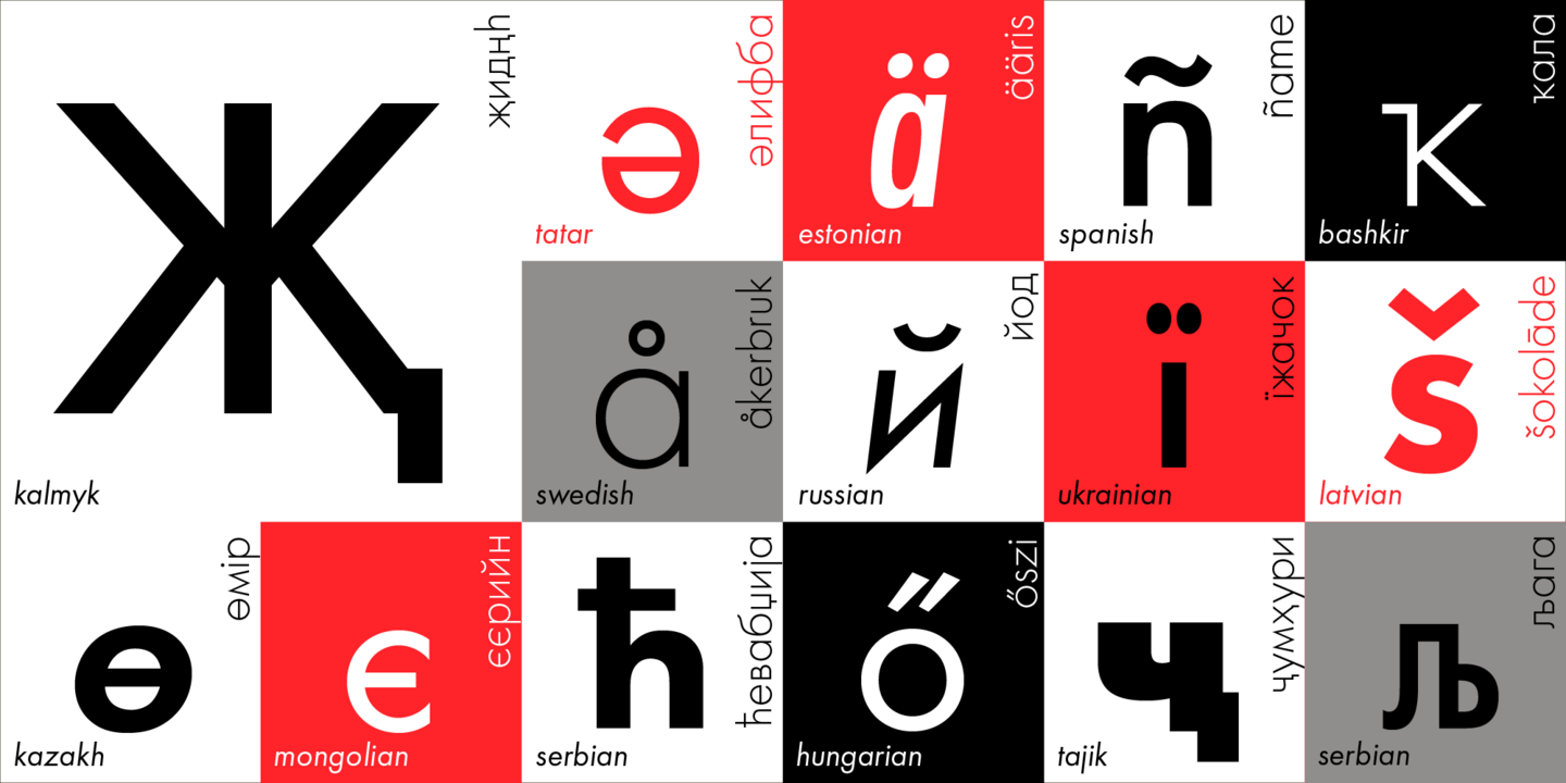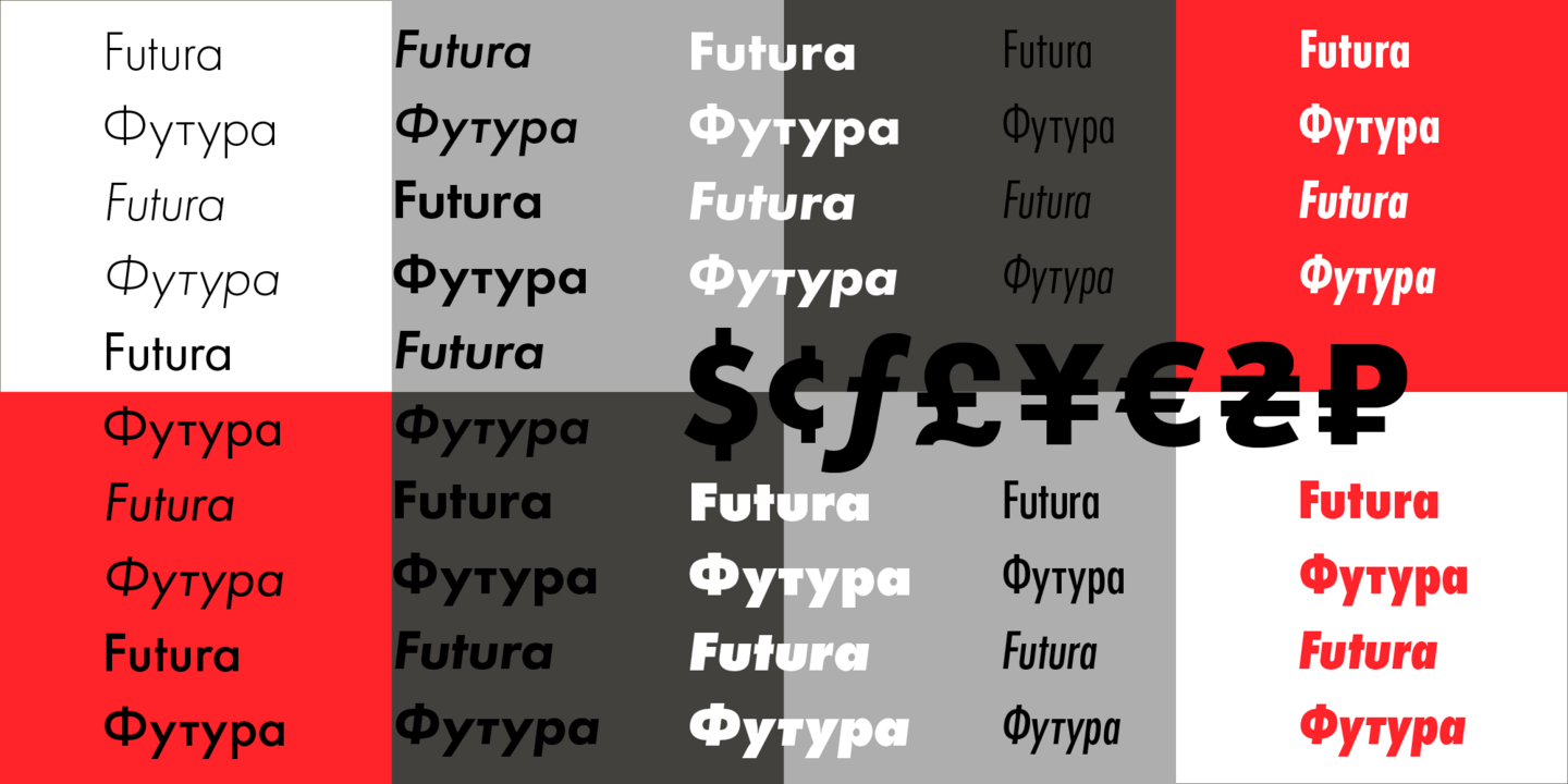 Futura is a classic geometric sans serif, one of the most influential typefaces of the 20th century in fact. Paul Renner introduced the original design for Bauersche Gießerei (Bauer Types, SL) back in 1927, basing his work on simple geometric forms to reflect the aesthetics of Constructivism and the Bauhaus. Futura PT, the most comprehensive Cyrillic version of Futura, includes 25 styles: eight upright, eight oblique, and nine condensed. Each typeface style contains over 690 glyphs and 18 OpenType features, with Futura PT supporting over 150 languages.