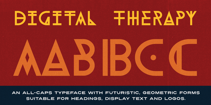 Digital Therapy is a futuristic typeface with geometric forms. It features heavily stylised all-caps letterforms suitable for logos, display text and headings.